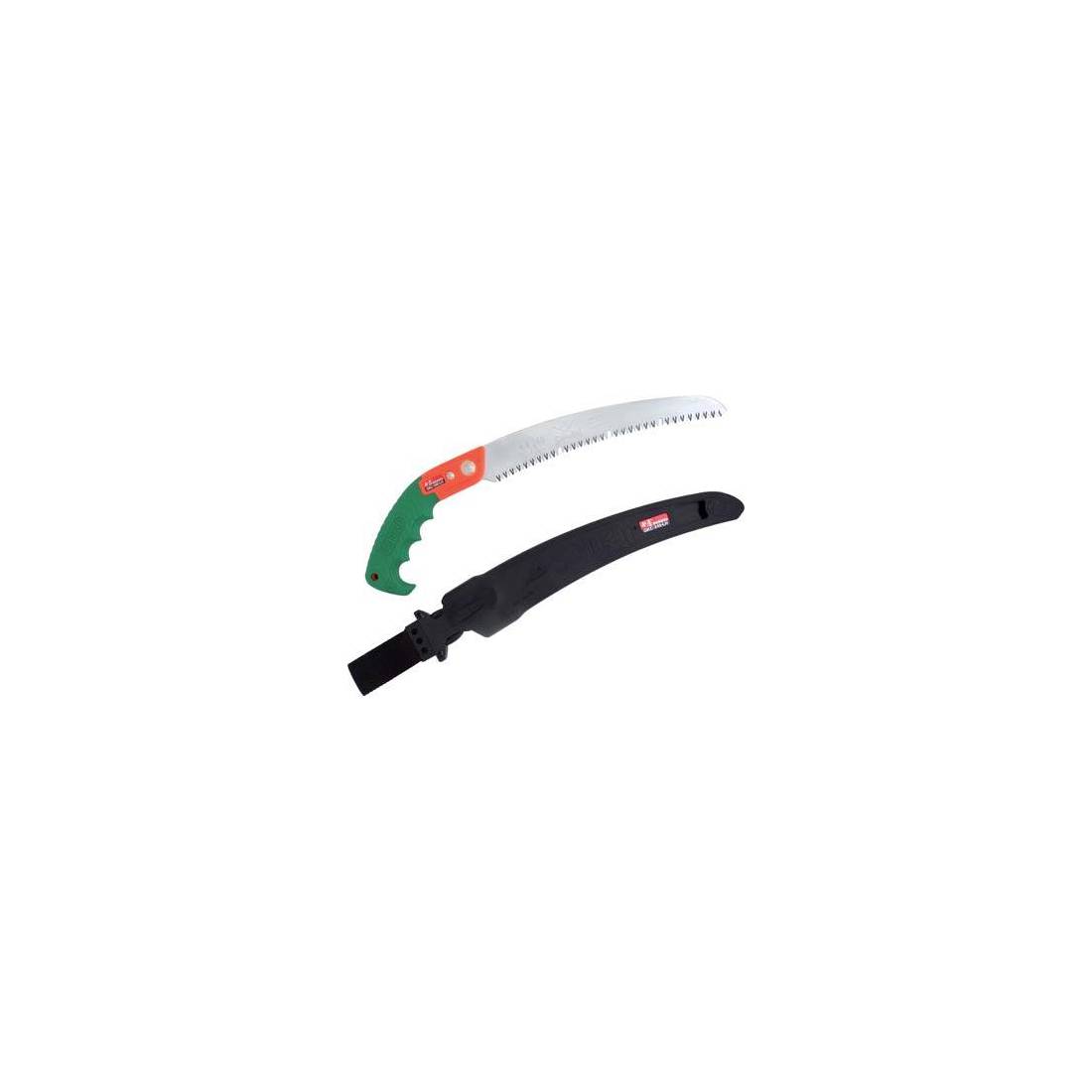 Lame en acier chromé, rectifiée concave pour limiter les frottements. Dents à pas de 4 mm, avec triple affûtage, trempées par impulsions. Avec des dents à racler qui alternent avec des espaces creux pour éliminer la sciure lors de la coupe de bois plus tendres. Manche ergonomique avec poignée pistolet. Livré avec étui. Idéal pour couper au-dessus de la hauteur des épaules.