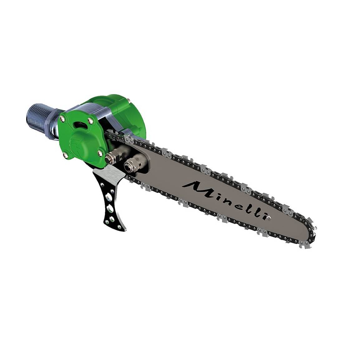 Sistema professionale a catena. Struttura in alluminio e tecnopolimero ad alta resistenza, capace di garantire leggerezza ed ottime caratteristiche meccaniche. Con predisposizione per montaggio su aste di prolunga fisse o telescopiche. Consumo aria 400/430 lt./min. Catena da 1/4', barra Carving 10', 8/10 bar. Prodotto 'Made in Italy'.