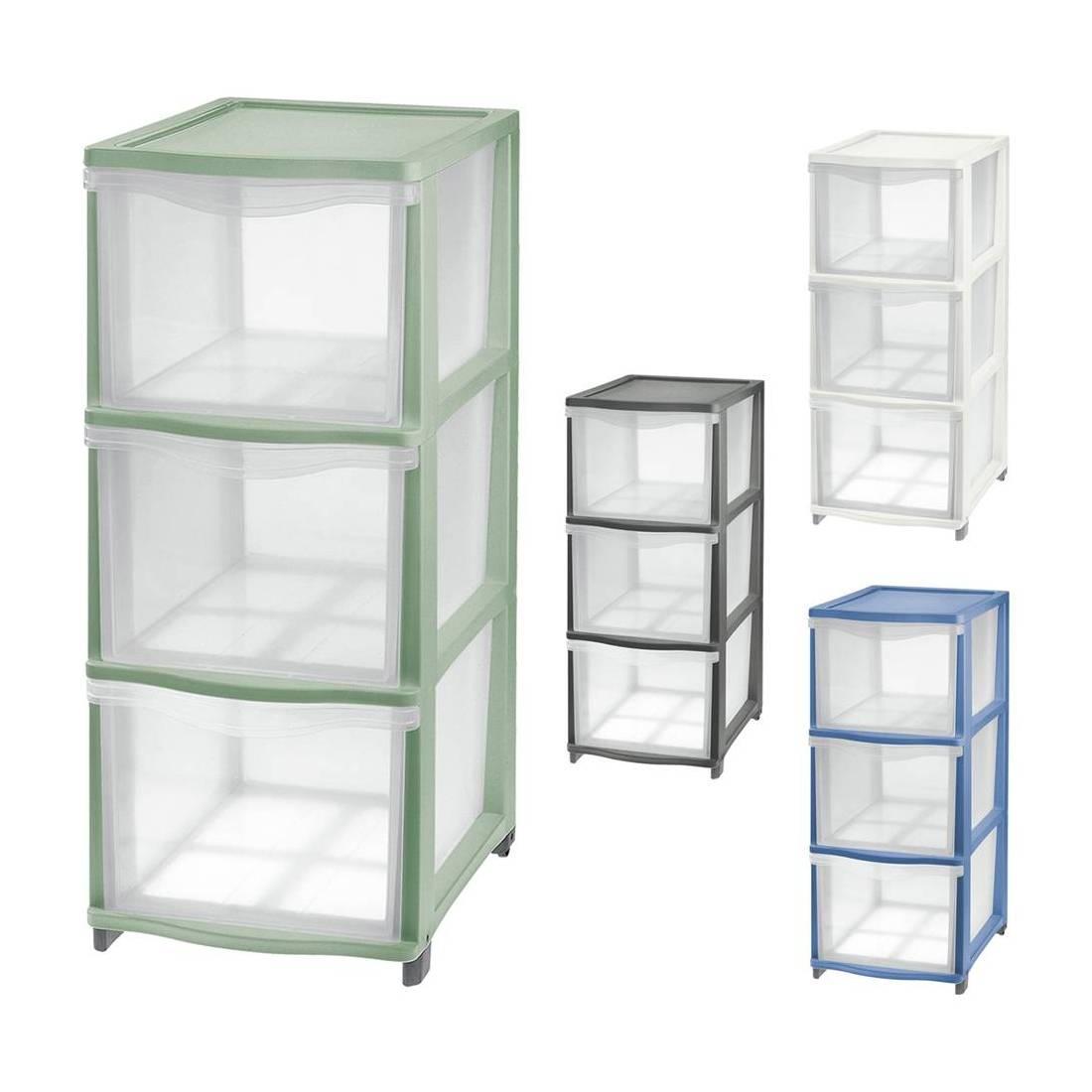 In plastica. A 3 cassetti alti. Dimensioni: cm. 26,8x37xh.63,1.