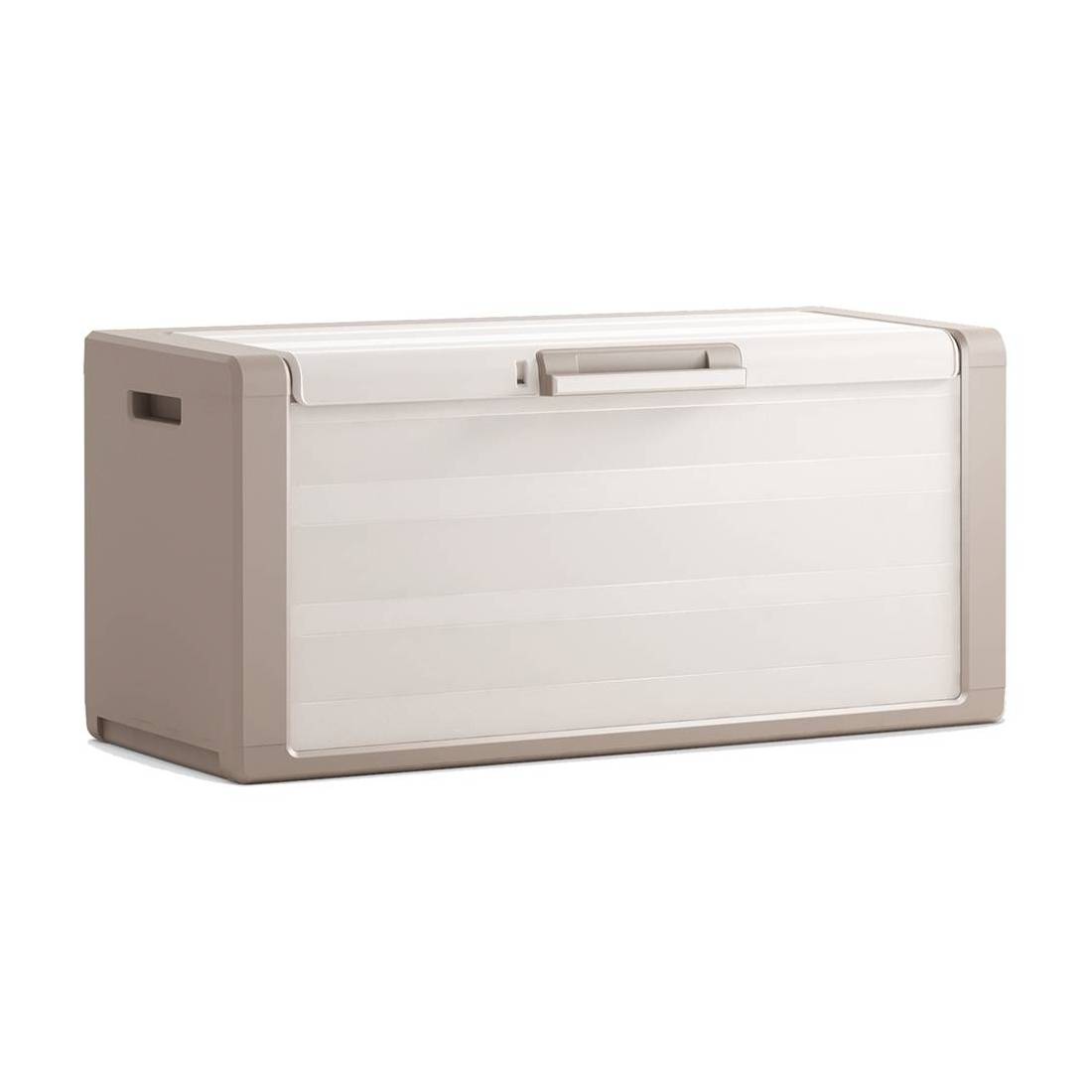 In resina. Ideale per riporre attrezzi, cuscini o qualsiasi altro oggetto. Resistente all'acqua, è dotato di predisposizione lucchetto e maniglie laterali integrate per trasporto e facili spostamenti. Stabile e robusto, è anche elemento di arredo per terrazze, balconi o giardini. Dimensioni: cm 49x118x55.