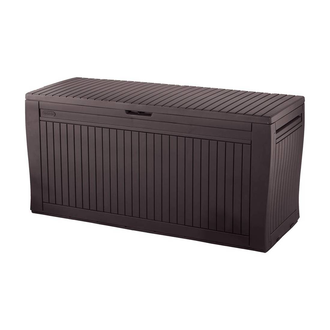 In resina, con trama effetto legno a doghe larghe. Ideale per riporre attrezzi, cuscini o qualsiasi altro oggetto. Sistema di ventilazione che consente di mantenere l'ambiente interno asciutto ed aerato. Stabile e robusto, è anche elemento di arredo per terrazze, balconi o giardini. Con maniglie incassate e rotelle per il trasporto. Misure: cm. 117 x 45 x h. 57