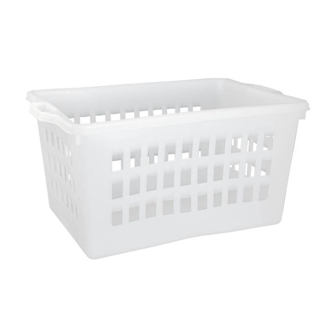 In plastica bianca traforata. Con manici. Capacità 60 litri.