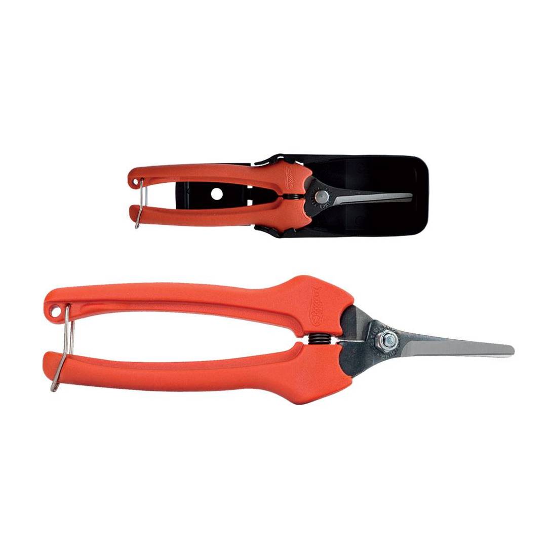 Lama diritta in acciaio inox, testa di taglio lunga e sottile piegata a 11 gradi per raggiungere gli steli più nascosti. Manico in poliammide e rinforzato da fibra di vetro. Adatta per vendemmia, raccolta frutti, fiori e ortaggi. Apertura 35 mm. Chiusura di sicurezza in metallo.