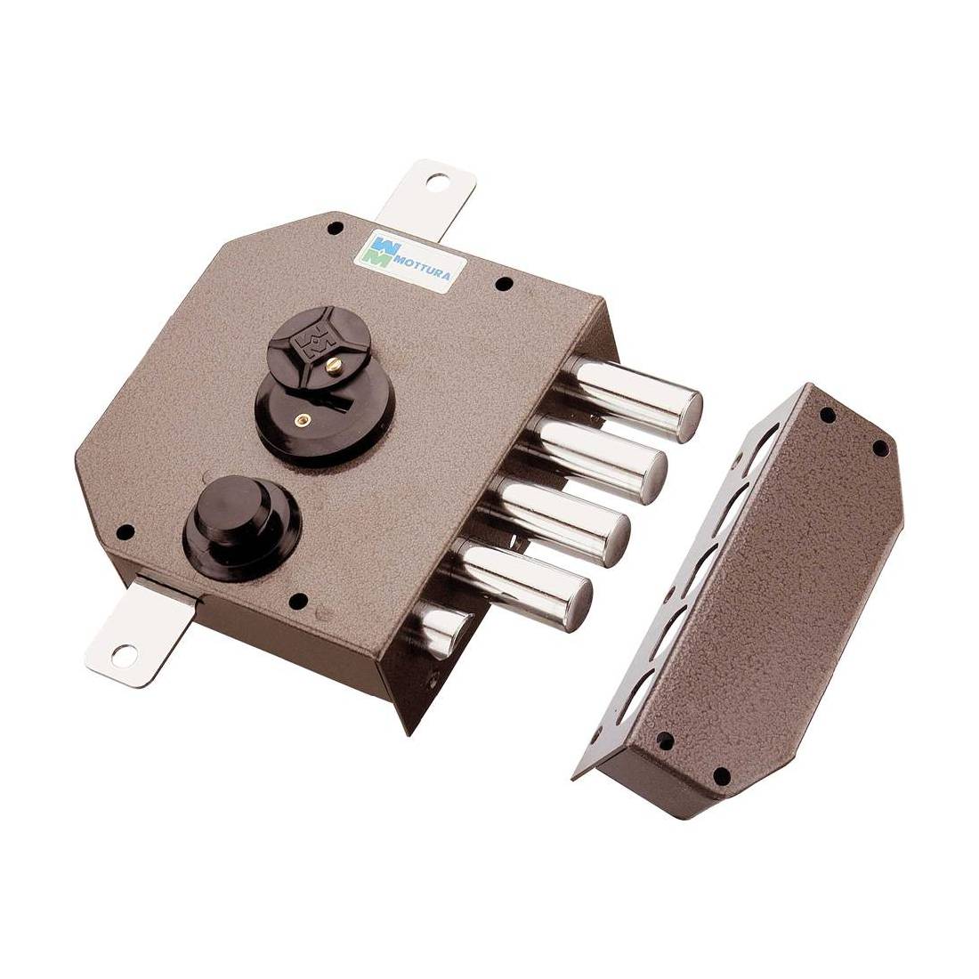 Con mezzo giro. Cilindro ø 30, corsa chiavistelli mm 40, chiave a doppia mappa mm 60, dimensioni scatola mm 132x146, finitura verniciata. Apertura interna con pomolo e chiave, corsa aste mm 17. Dotazione 3 chiavi. Senza aste.