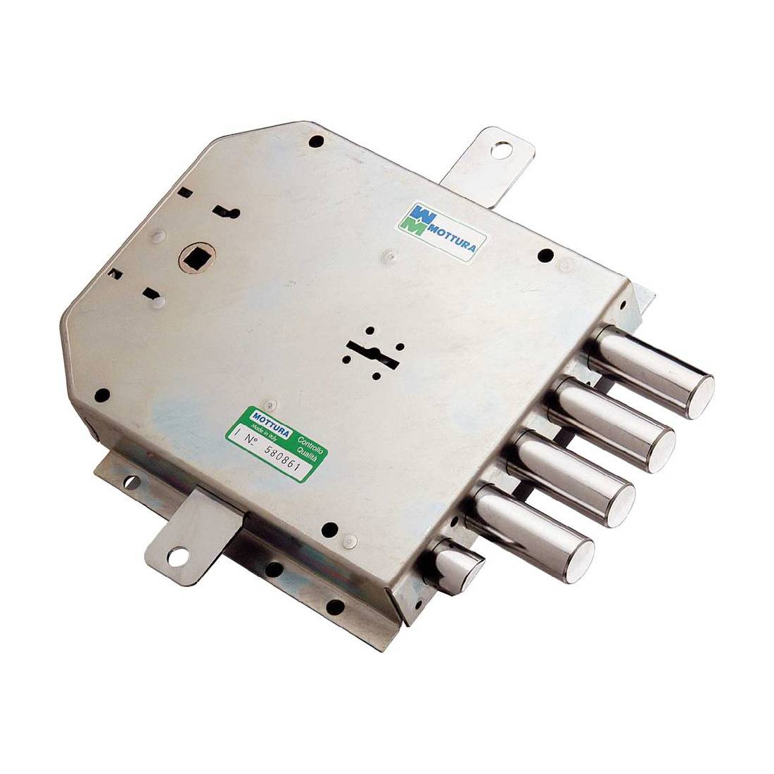 Quattro mandate, mezzo giro Ø 18 mm azionato da chiave, quadro maniglia Q8. Quattro chiavistelli tondi Ø 18 mm con interasse mm 25. Corsa chiavistelli mm 40. Corsa aste mm 17. Senza aste.