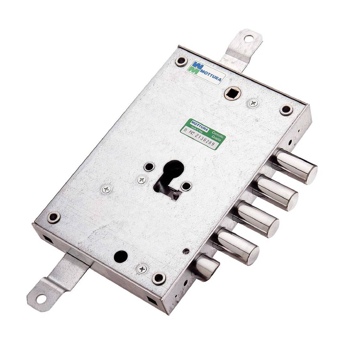 Foro cilindro europeo, fissaggio attacco Mottura. Due mandate, mezzo giro per cilindro Ø 20 mm reversibile azionato da chiave, quadro maniglia Q8. Quattro chiavistelli tondi Ø 18 mm con corsa mm 29. Corsa aste mm 20. Senza aste.