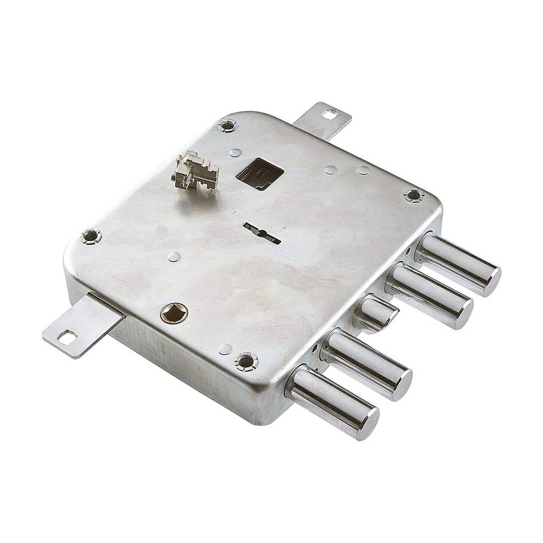 Triplice, con scrocco azionato da quadro maniglia mm 8 inferiore, 4 catenacci. Scatola mm 162x145. Corredata di 3 chiavi e blocchetto chiave di prova. Finitura zincata. Per porte blindate.