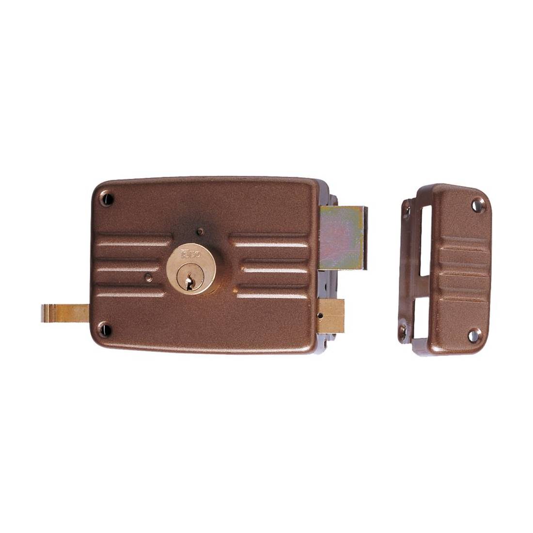 Serratura per legno, cilindro interno fisso, scrocco separato con tirante interno e richiamo con chiave esterno. Dotata di bocchetta, ghiera e tre chiavi.