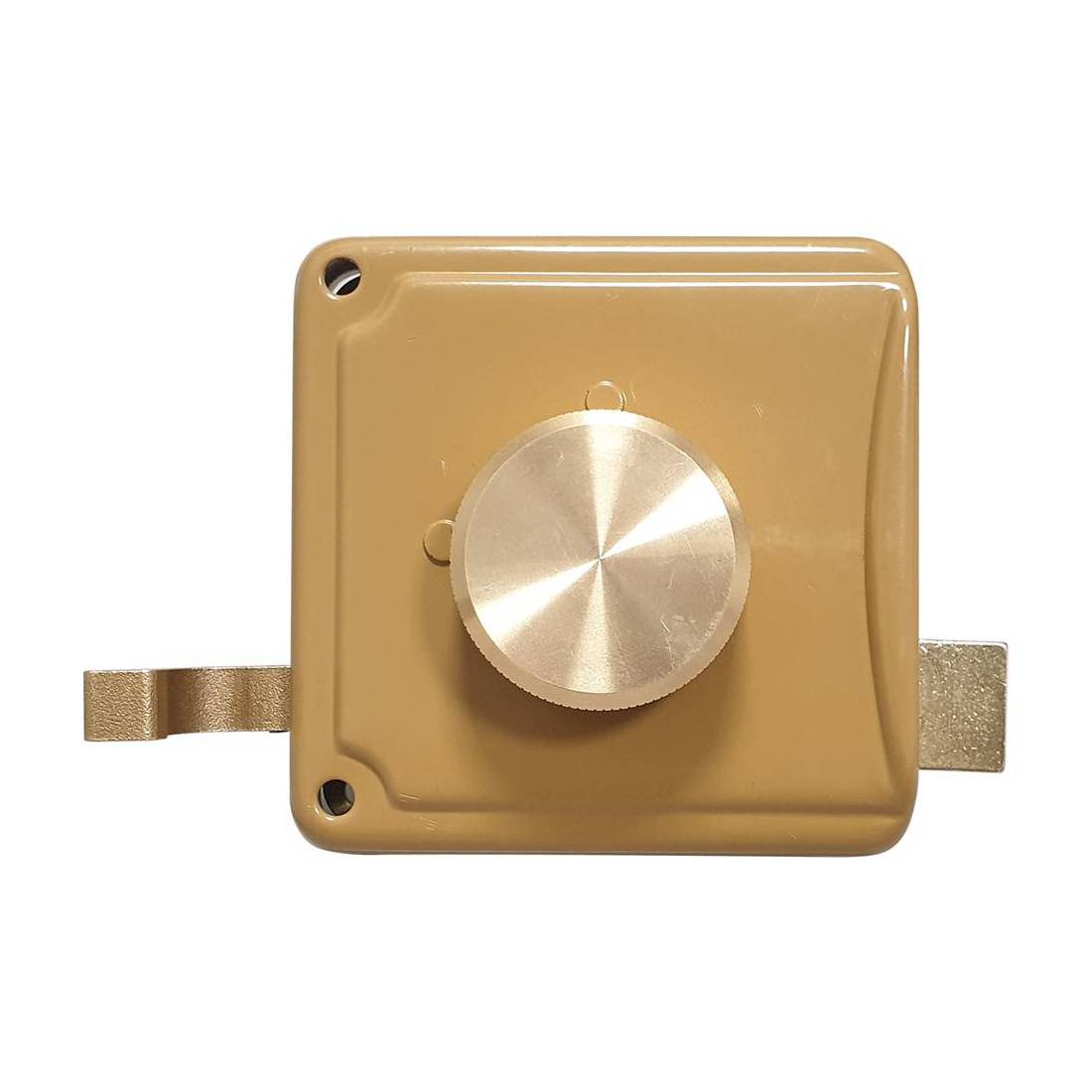 Cilindro staccato esterno, pomolo interno, scrocco. Cilindro a 5 pistoncini (2 antimanipolazione). Scatola a finitura verniciata elettrostaticamente con polvere epossidica color nocciola. Completa di 3 chiavi in ottone nichelato, bocchetta, borchia e viti di fissaggio. In scatola.