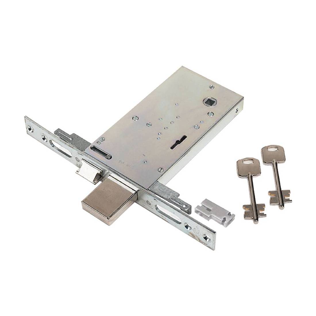 Per porte in ferro. Finitura in acciaio inox. Asole per il montaggio facilitato delle aste interne. Frontale 28 mm. Dotazione: 2 chiavi, 1 coprifrontale in acciaio inox, 1 rosetta in acciaio zincato, 2 attacchi M8 per aste filettate, 1 asta guida chiave.