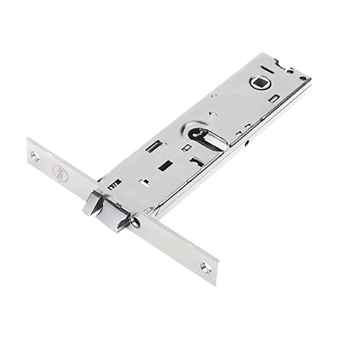 Per porte in alluminio. Con scrocco, realizzata in acciaio. Foro ovale per cilindro, scrocco e pistone di ricarica reversibili. Vite di fissaggio per cilindro. Senza cilindro. Alimentazione 12V.