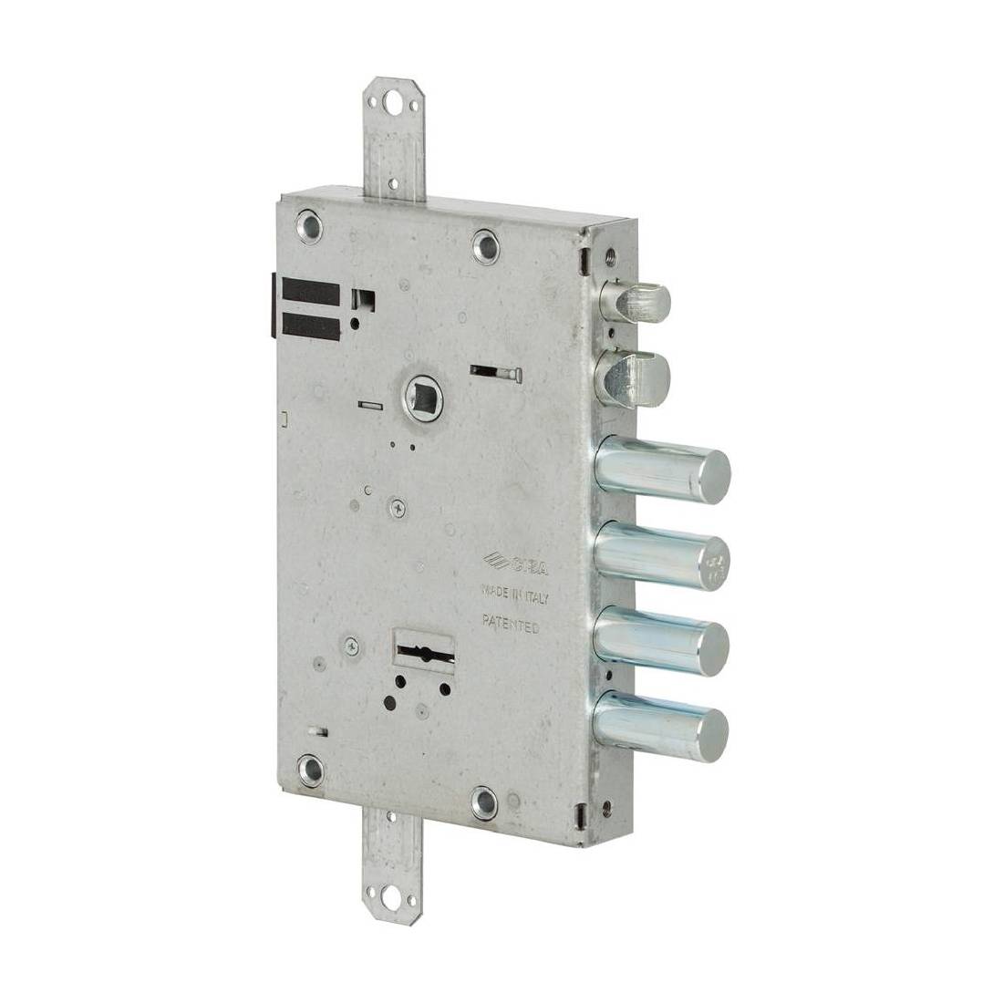 Doppia mappa. Scrocco e catenaccio. Scatola in acciaio, scrocco e catenaccio in acciaio zincato ad alta resistenza. Tensione 12V, scrocco autobloccante richiamabile elettronicamente. Fornita senza aste. Con tre chiavi più una di servizio.