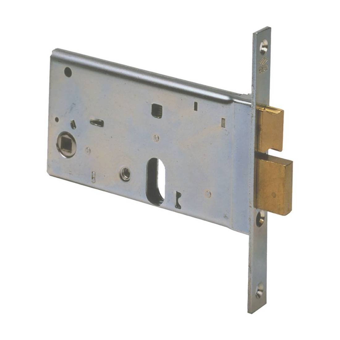 Foro cilindro europeo ovale. Con scrocco e catenaccio. Scatola e frontale zincato. Scrocco in ottone, altezza scatola 77 mm, 2 mandate. Quadro maniglia mm 8. Frontale 16 mm. Interasse 67 mm. Dotazione vite di fissaggio cilindro. Senza cilindro.