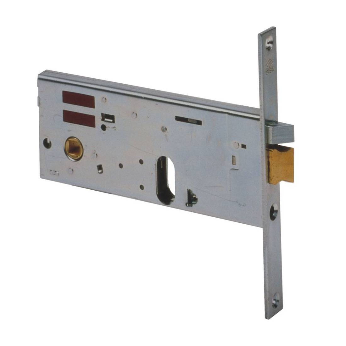 Foro cilindro europeo ovale. Con scrocco autobloccante. Scatola e frontale zincato. Scrocco in ottone, altezza scatola 64 mm. Tensione 12V, quadro maniglia mm 8. Dotazione vite di fissaggio cilindro. Senza cilindro.