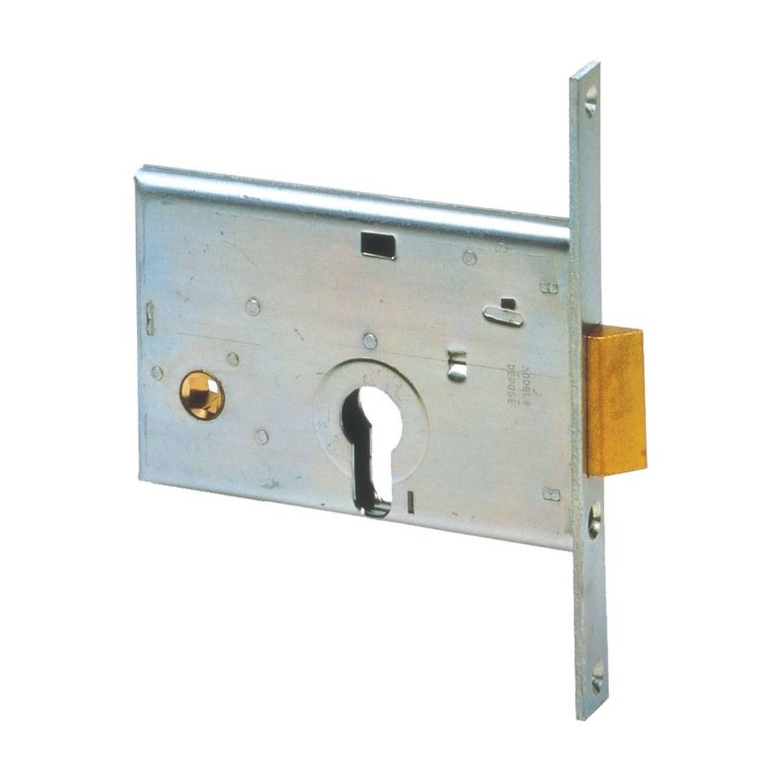 Foro cilindro europeo. Con scrocco reversibile e catenaccio incorporato. Scatola e frontale zincato. Scrocco e catenaccio in ottone, altezza scatola 82 mm. A 1 mandata, quadro maniglia mm 8. Dotazione vite di fissaggio cilindro. Senza cilindro.