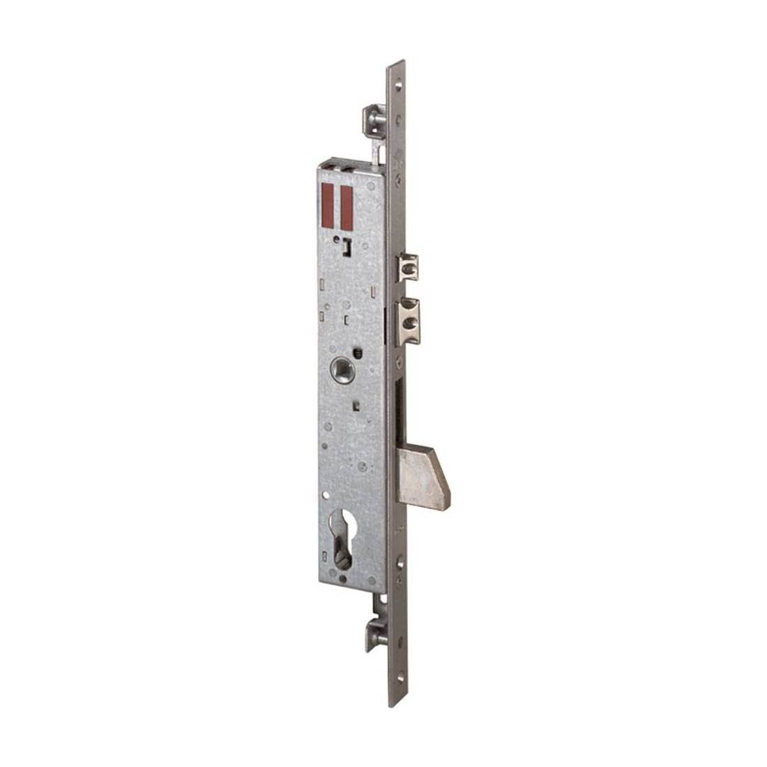 Chiusura triplice. Scatola acciaio zincato, frontale acciaio inox. Foro cilindro europeo. Tensione 12V, quadro maniglia mm 8. Catenaccio basculante e scrocco nichelati. Scrocco e pistone regolabili da 10,5 a 16,5 mm. Frontale 22 mm, interasse 85. Coppia borchie nylon e perni filettati per fissaggio aste. Senza cilindro.