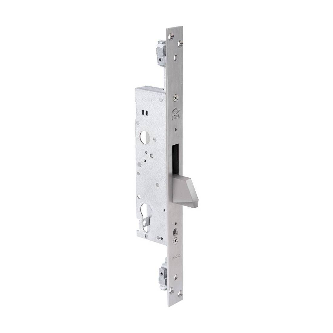 Scatola in acciaio con rivestimento in zinco. Foro cilindro europeo. Catenaccio nichelato. Frontale 25 mm. Predisposizione per chiusure supplementari con boccole filettate M8. Dotazione vite fissaggio cilindro. Senza cilindro.
