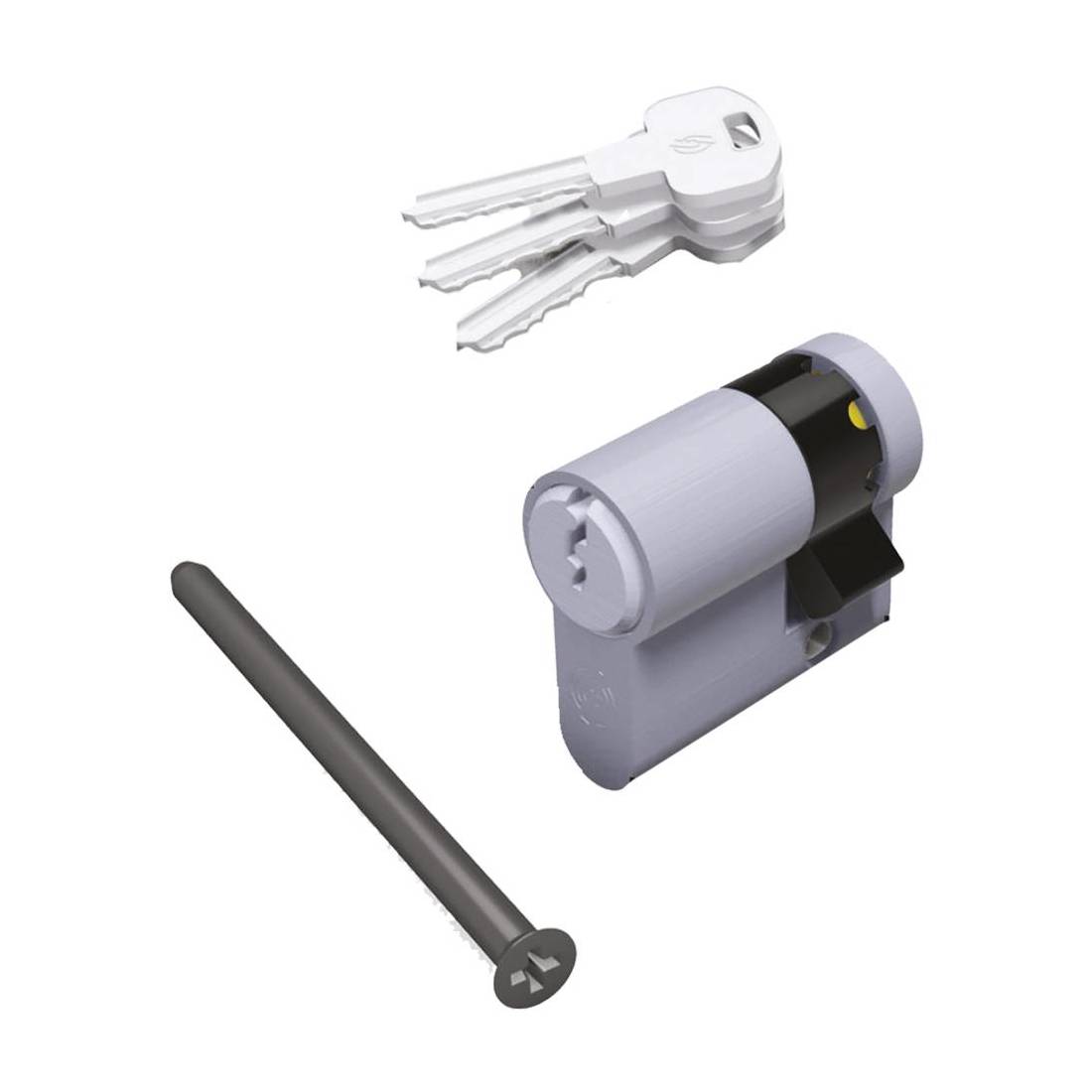 Profilo europeo, a chiave standard verticale. A 5 spine, leva DIN 30. Dotazione tre chiavi standard e vite di fissaggio. Testato e certificato EN 1303:2015.