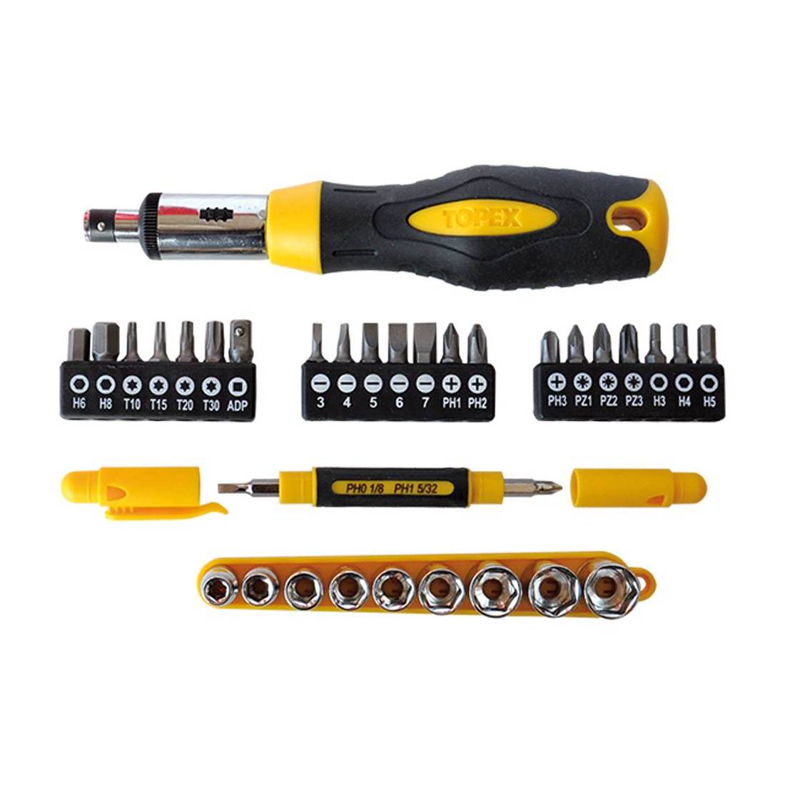 Cricchetto in cromo-vanadio. Manico in gomma antiscivolo. Completo di 30 inserti.
