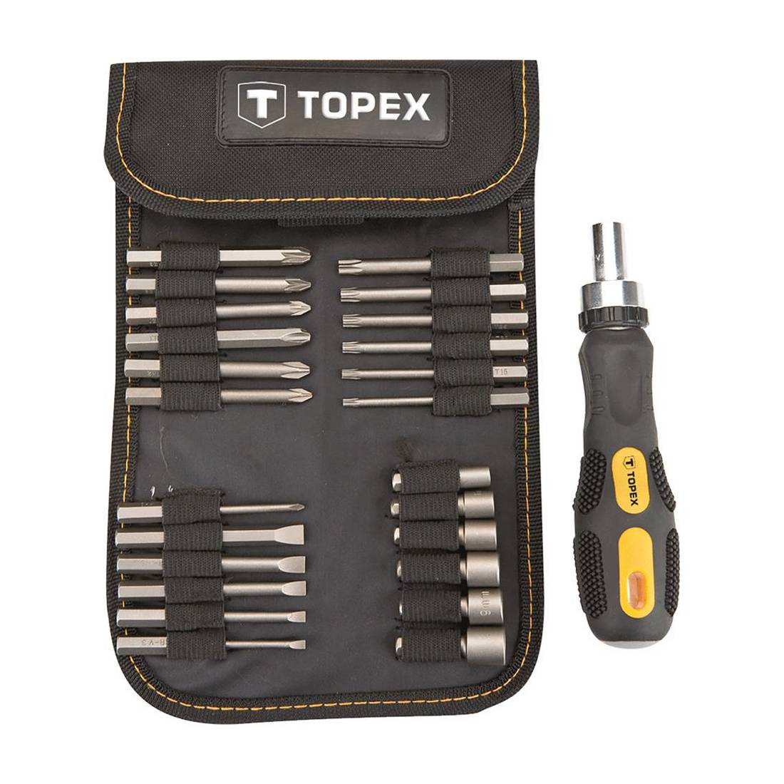 Con inserti e bussole in acciaio cromo-vanadio. In borsa di stoffa ripiegabile. Composizione: impugnatura, 6 bussole (5,6,7,8,9,10 mm), 18 bit (3,4,5,6,7 mm), PH0, PH1, PH2, PH3, PZ1, PZ2, PZ3, Torx T10, T15, T20, T25, T27, T30, 1 attacco magnetico 1/4'.