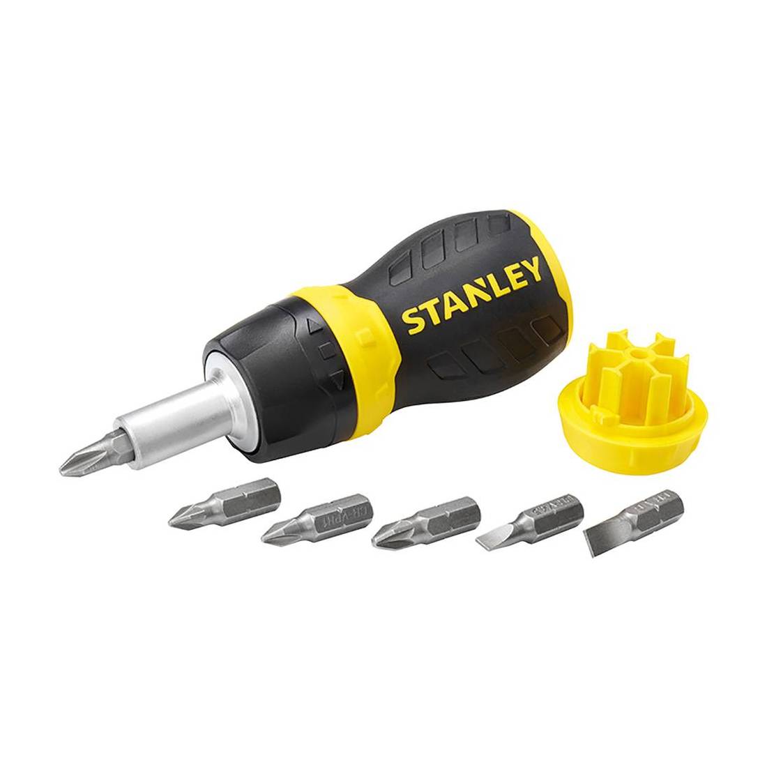 Impugnatura in bicomponente. Estremità interna per alloggiamento inserti. Meccanismo di movimento a cricchetto a 3 posizioni. Fornito con 6 bit: Ph 1-2, Pozi 1-2, Std 4-6.
