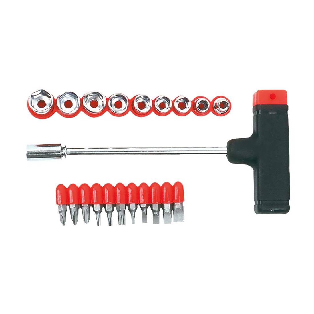 Composto da: 9 bussole (mm 5>12), 5 inserti a lama dritta (mm 3>8), 3 inserti a lama a corce (N.1-2-3), 3 inserti pozidrive (N.1-2-3). Manico a 'T'. Attacco 1/4'.