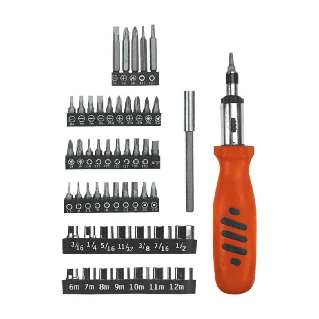 Composizione: 1 avvitatore con cricchetto reversibile, 1 prolunga da mm 100, 1 adattatore, 11 inserti esagonali H1,5 - H2 -H2,5 - H3 - H4 - H5 - H5,5, H6, S2, S3, 9 inserti T10 - T15 - T20- T25 - T27 - T30 - T40 - 2 - 3, 4 inserti a taglio mm. 3 - 4 - 5, 6, 6 inserti a croce PH0 - PH1 - PH2 - PH3 - PZ0 - PZ1, 14 bussole esagonali misura 6 - 7 - 8 - 9 - 10 - 11 - 12 - 1/2 - 7/16 - 3/8 - 11/32 - 5/16 - 1/4 - 3/16, 5 inserti da 50 mm T15 - T20 - 2 - 2 - 6.