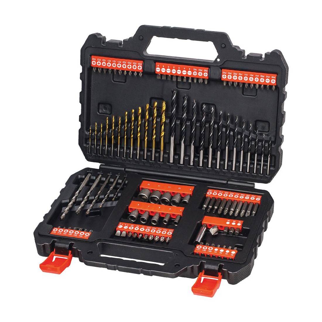In valigetta plastica. Composizione: 12 punte metallo (1,5-2-2,5-3-3,5-4-4,5-5-5,5-6 mm), 13 punte legno (3,5-4-4,5-5-5,5-6-6,5-7-7,5-8 mm), 5 punte muro (3-5-6-8-10 mm), 54 inserti da 25 mm, 13 inserti da 50 mm, 10 chiavi a bussola. Con 1 adattatore magnetico, 1 punta per svasare.