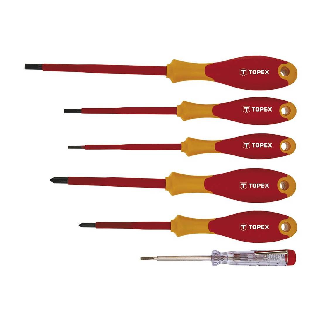 In acciaio al cromo molibdeno di alta qualità. Isolati 1000V. Impugnatura ergonomica in plastica, rivestita con materiale antiscivolo. Composizione: 5 cacciaviti (3x100 mm, 4x100 mm, 5.5x100 mm, PH1x80 mm, PH2x 100 mm), 1 tester di tensione 125-250V.