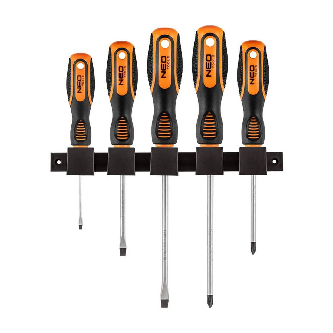 A punta magnetica. Manico bimateriale di forma triangolare, con poggia pollice sagomato che riduce il carico. Impugnatura anti scivolo, resistente a sostanze chimiche, oli e grassi. Stelo in acciaio cromo vanadio. Composizione: 3x75mm, 5,5x100mm, 6,5x150mm (piatti), PH1x100mm, PH3x150mm (croce).