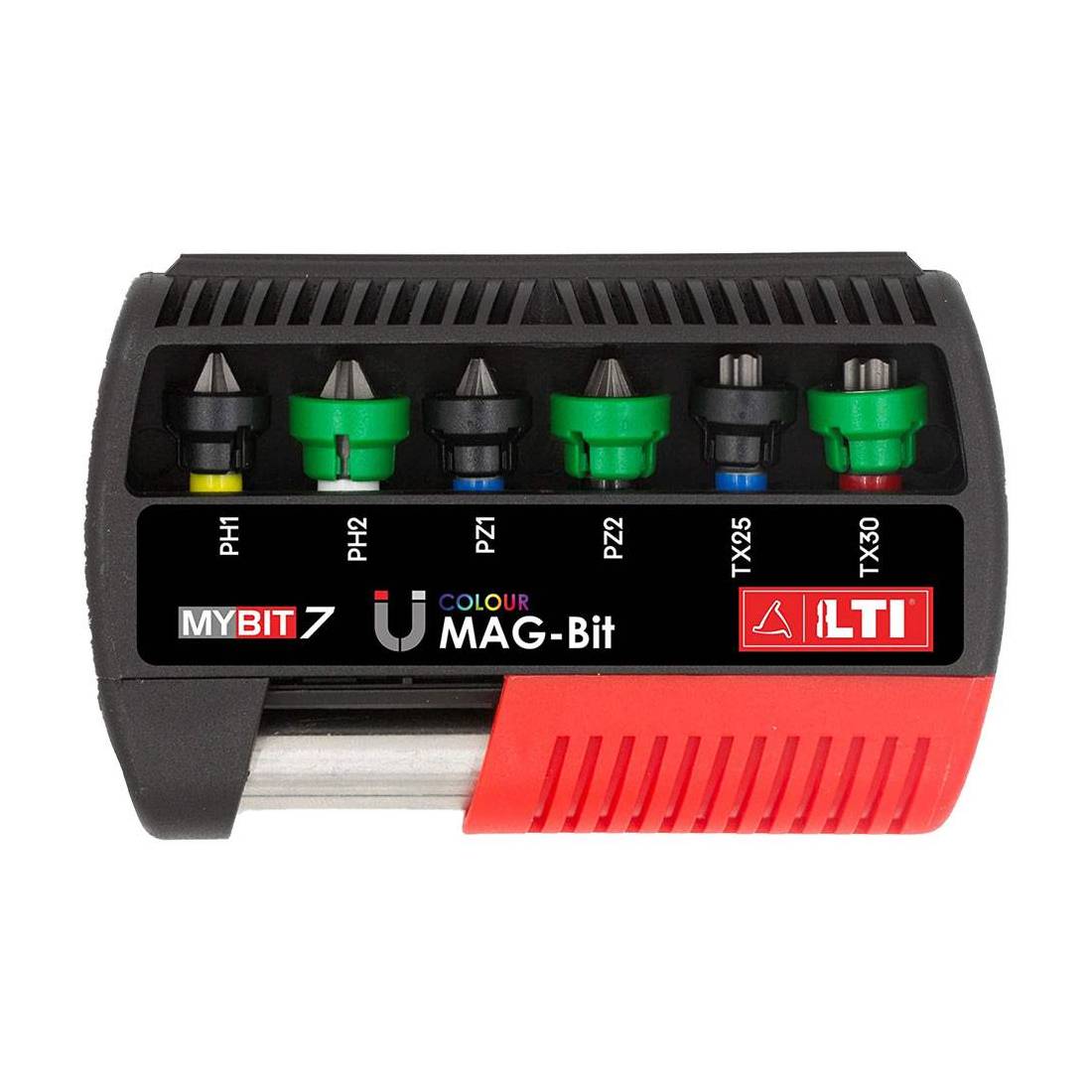 Con sistema di trattenimento magnetico della vite. Composizione: 2 inserti PH (PH1 e PH2), 2 inserti PZ (PZ1 e PZ2), 2 inserti TX (TX25 e TX30). Con 1 adattatore magnetico 1/4.