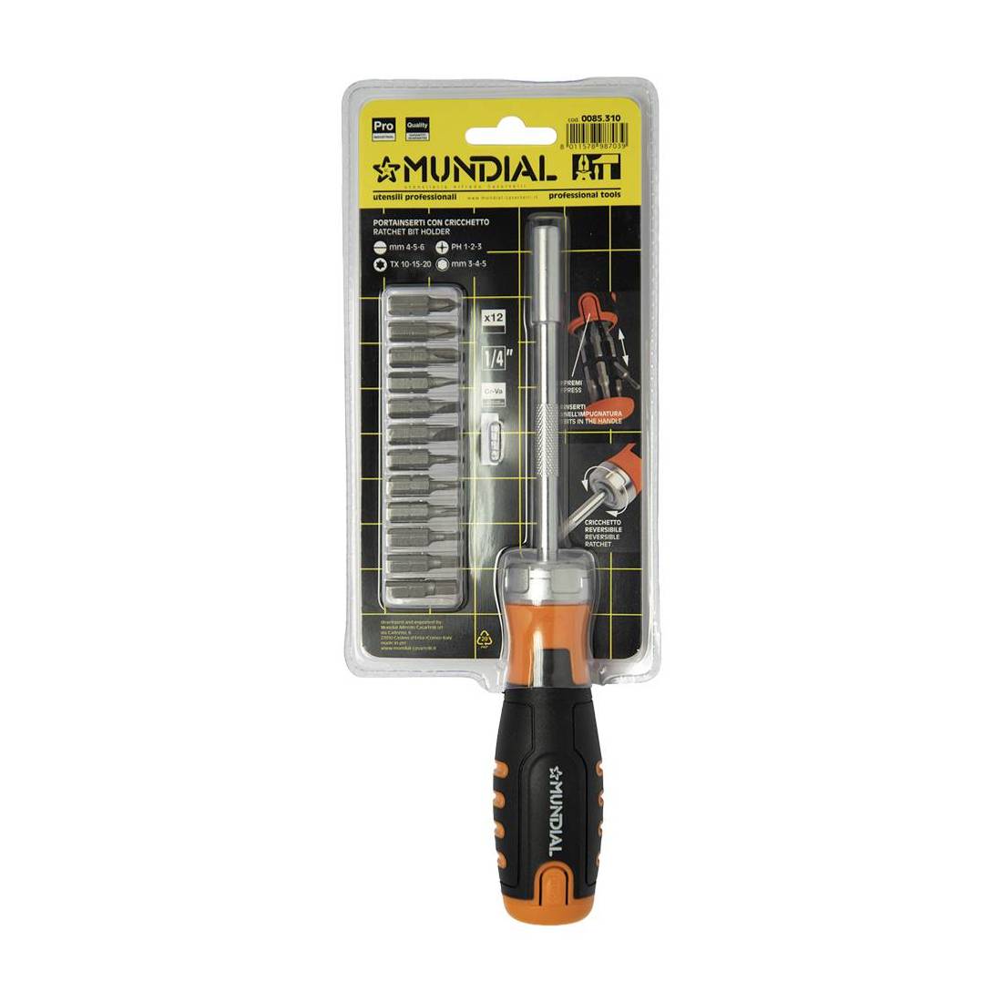 Con cricchetto reversibile, impugnatura ergonomica e antiscivolo dotata di sistema portainserti integrato. Il manico contiene inserti facilmente accessibili premendo sul fondo. Inclusi 12 bit: mm 4-5-6-PH1-PH2-PH3-TX10-TX15-TX20-E3-E4-E5.