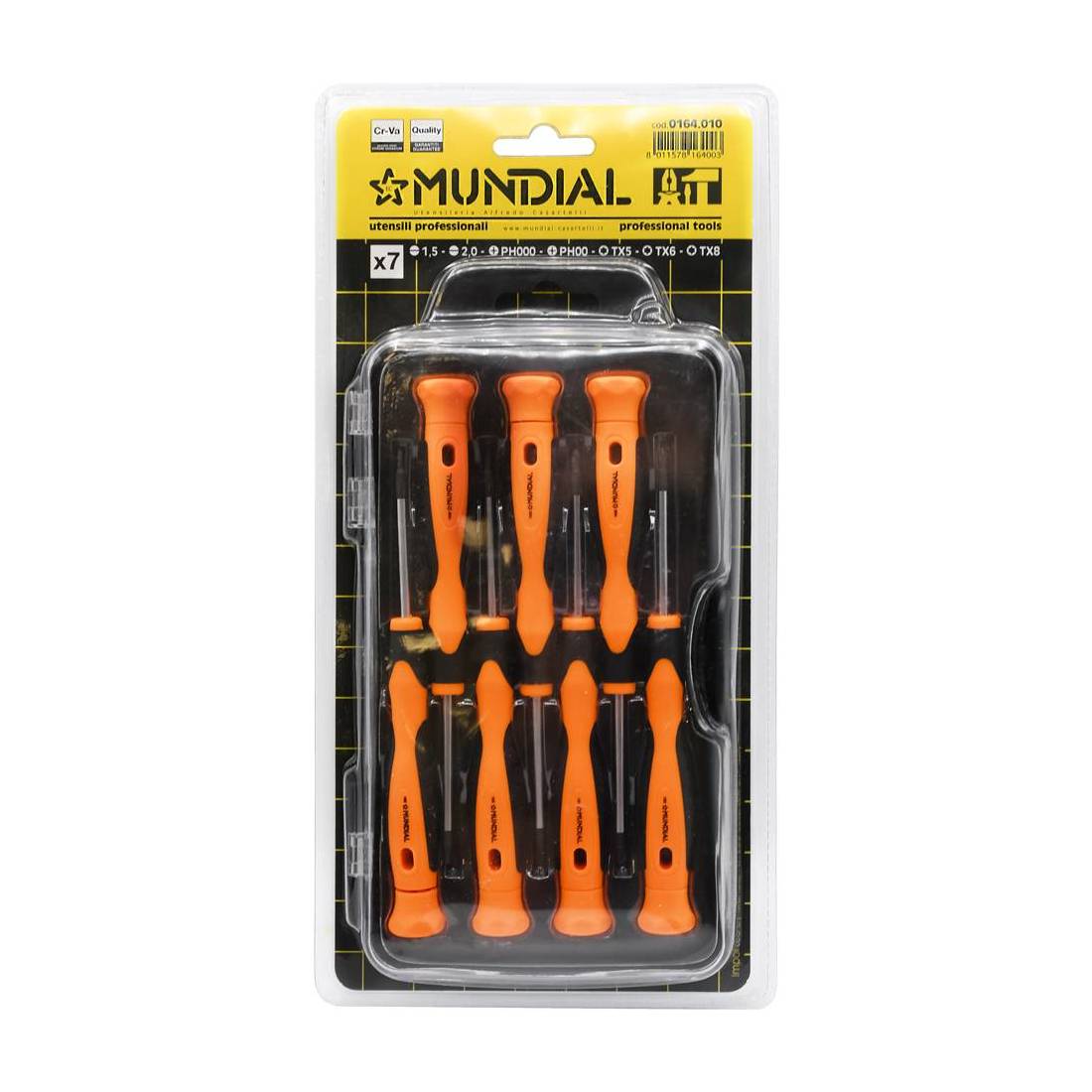 Composto da 7 giraviti ideale per lavori di elettronica. Comprende punte: n. 2 a taglio (da 1,5 x 50 e 2 x 50), n. 2 a croce PH (da 000 x 50 e 00 x 50) e N.3 a Torx (da TX 5 x 50, TX 6 x 50 e TX 8 x 50).