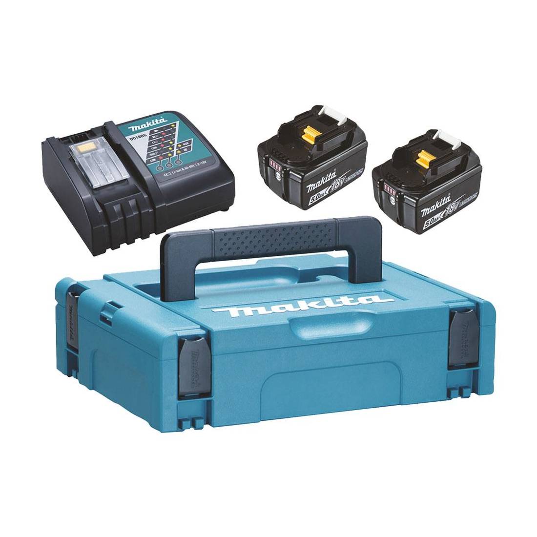 Set completo di caricabatteria rapido e 2 batterie 5 Ah Litio 18V. Con sistema 'Makstar', carica con estrema velocità e sicurezza (tempo di carica medio circa 45 min). Dispone di controllo attivo della temperatura, controllo corrente e tensione di ogni singola cella in maniera costante. In valigetta.