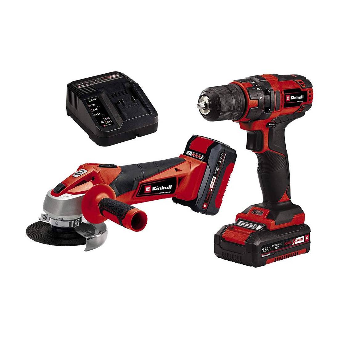 Kit contenente: 1) Trapano avvitatore: mandrino autoserrante in metallo da 13 mm, numero di giri: 0-550 min, torsione: 20+1 posizioni, torsione: 35 Nm. Controllo elettronico della velocita', led incluso. Estremamente confortevole durante il lavoro grazie al soft grip. 2) Smerigliatrice angolare: diametro disco: 115mm, numero giri: 8.500 min-1, profondita' di taglio massima: 28 mm. Con impugnatura laterale gommata, regolabile su 3 posizioni per maggiore controllo e comodita'. Kit fornito con: batteria da 1,5 Ah, batteria da 3,0 Ah e con caricabatteria.