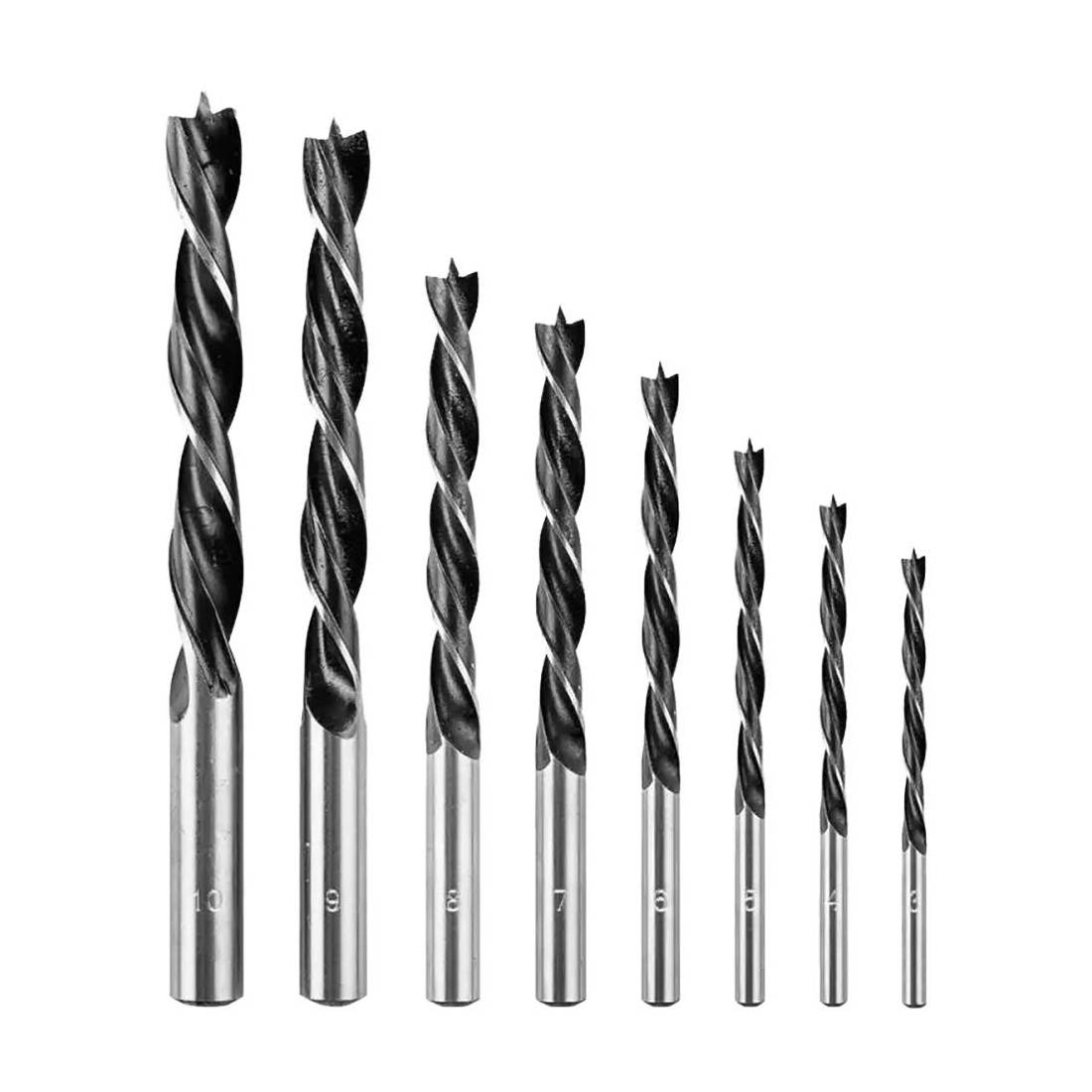 Set composto da 8 punte per trapano con diametri da 3 a 10 mm, dotate di pratica impugnatura cilindrica. Progettate per forare con precisione legno e compensato, consentono di lavorare a diverse profondità grazie a una lunghezza complessiva variabile da 60 a 120 mm in base al diametro: 3 mm - 1800 giri/min, 4 mm - 1800 giri/min, 5 mm - 1700 giri/min, 6 mm - 1400 giri/min, 7 mm - 1200 giri/min, 8 mm - 900 giri/min, 10 mm - 700 giri/min.