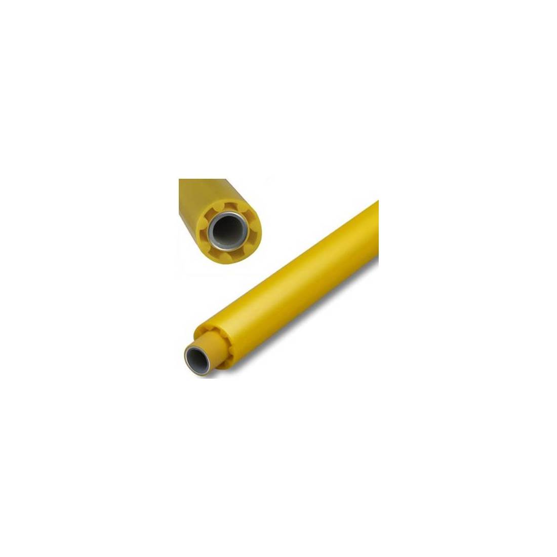PEX-b+Al+PEX-b (polyéthylène+aluminium+polyéthylène). Le tuyau multicouche Multigas est isolé par une chambre à air en polyéthylène haute résistance (DianFlex). Dimensions : 20x2.