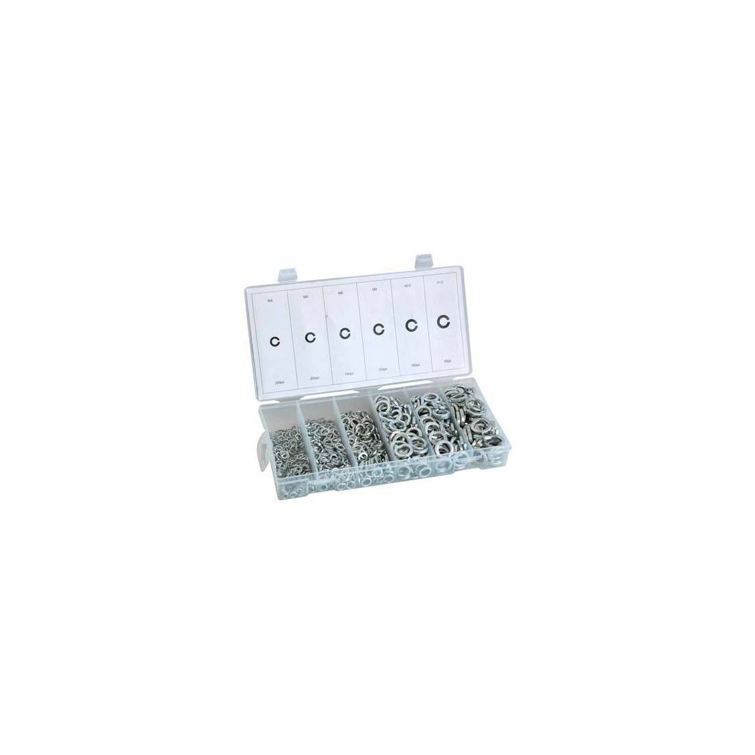 Kit de 800 pièces assorties, en acier zingué. Contenu : 200 pièces M4, Ø extérieur 7,60 mm, Ø intérieur 4,10 mm, épaisseur 0,9 mm ; 200 pièces M5, Ø extérieur 9,20 mm, Ø intérieur 5,10 mm, épaisseur 1,20 mm ; 150 pièces M6, Ø extérieur 11,80 mm, Ø intérieur 6,10 mm, épaisseur 1,60 mm ; 100 pièces M8, Ø extérieur 14,80 mm, Ø intérieur 8,20 mm, épaisseur 2 mm ; 100 pièces M10, Ø extérieur 18,10 mm, Ø intérieur 10,20 mm, épaisseur 2 mm ; 50 pièces M12, Ø extérieur 21,10 mm, Ø intérieur 12,20 mm, épaisseur 2,50 mm.