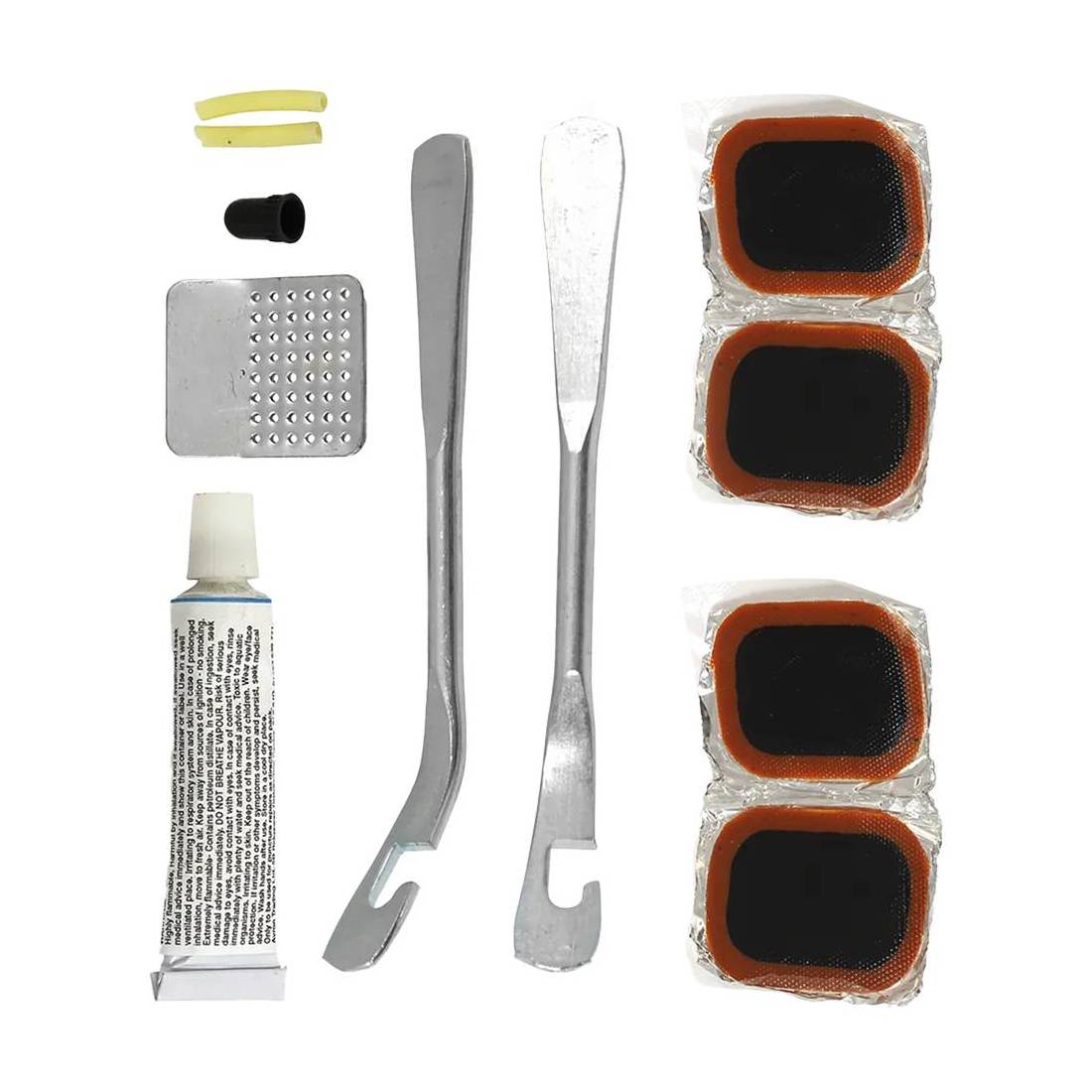 Contenuto: 2 tappi per valvola camera d'aria. 4 adesivi. 2 leve per pneumatici. 2 levette. 1 tubetto di colla. 1 carta vetrata.
