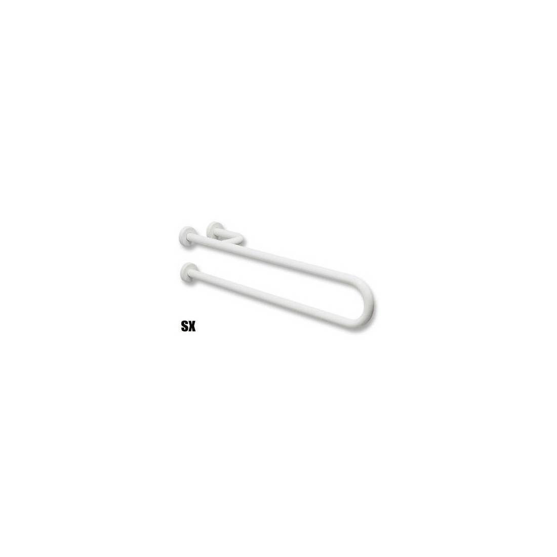 Barra di sostegno con rinforzo lunghezza 85 cm, con fissaggio a muro realizzato in acetalico (materiale plastico ad altissima resistenza) studiato in collaborazione con il Politecnico di Milano per rispondere alle seguenti esigenze: 1) resistenza a carichi sul maniglione di almeno 150 kg, 2) perfetto isolamento elettrico per evitare la trasmissione di correnti vaganti.Vite di fissaggio in acciaio inox.(DianFlex) Misura: Sinistro