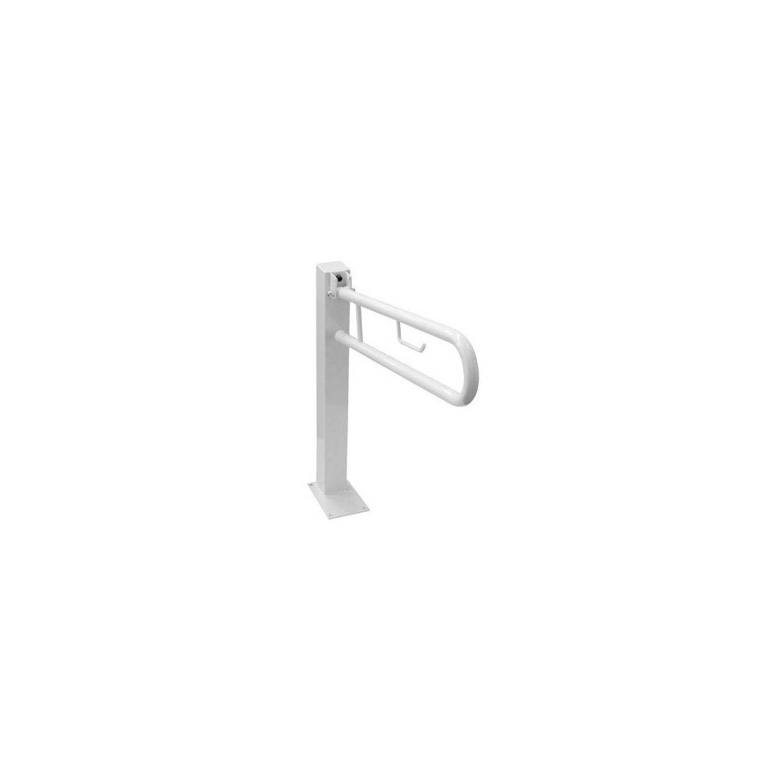 Barra di sostegno ribaltabile montata su colonna fissata a pavimento. Tubo di acciaio ø 32 mm spessore 1,5 mm. Verniciatura a polvere – bianco ral 9010. Completo di piattelli e borchie per il fissaggio a muro. Capacità tenuta: 150Kg. Le confezioni non contengono i tasselli di fissaggio.(DianFlex) Misura: cm 65