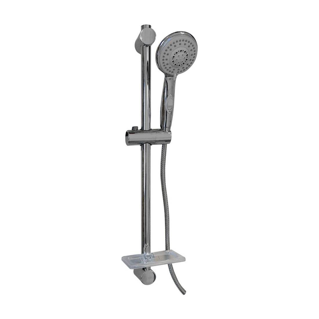Doccetta in ABS, cromato, flessibile in acciaio inossidabile con doppia chiusura, Ø 13,5 mm, lunghezza 150 cm. Inserto in plastica. Barra scorrevole rimovibile, con tubo in acciaio cromato, Ø 25 mm, lunghezza totale 65 cm. Con portasapone trasparente.