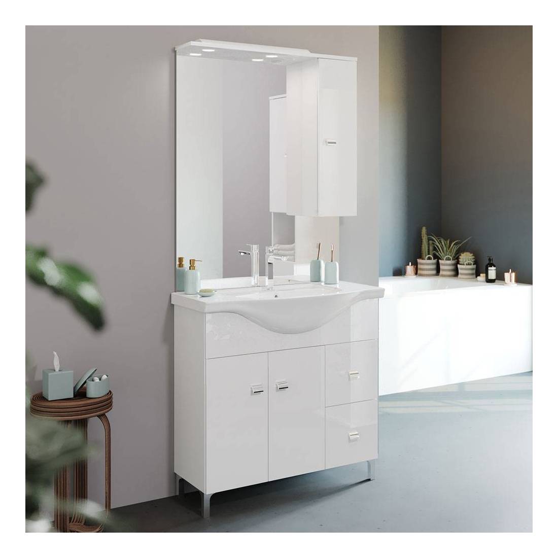 Combinato di accessori, caratterizzati da un design piacevole, moderno ed elegante per arredo bagno. Composto da base a due ante e due cassetti laterali destri, pensile superiore lato destro tutti in MDF rivestito bianco e corredati da maniglie in ABS cromate. Lavabo in ceramica bianco lucido, specchio con illuminazione led IP44 superiore. Bordi in ABS, piedini regolabili cromati. Dimensioni specchio cm.81x17,5xh.104. Dimensioni espresse (larghezza x profondità x altezza).