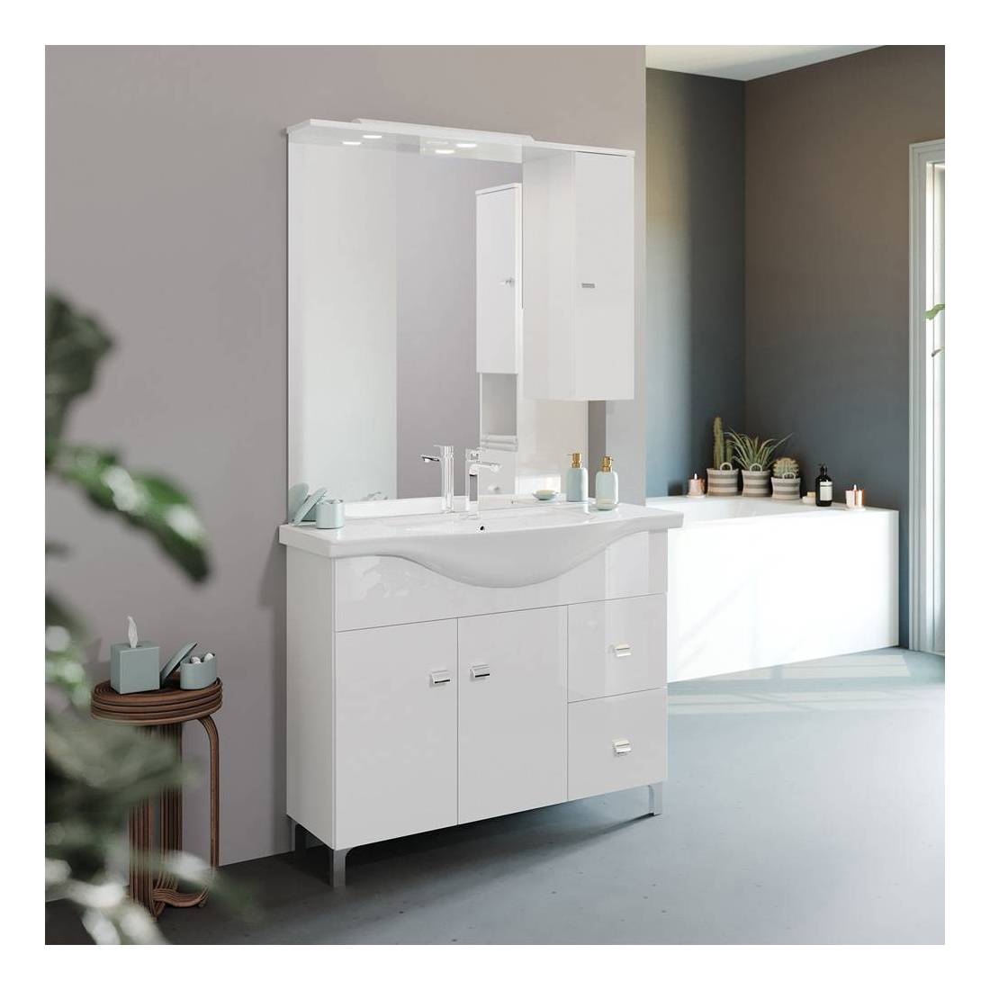 Combinato di accessori, caratterizzati da un design piacevole, moderno ed elegante per arredo bagno. Composto da base a due ante e due cassetti laterali destri, pensile superiore lato destro tutti in MDF rivestito bianco e corredati da maniglie in ABS cromate. Lavabo in ceramica bianco lucido, specchio con illuminazione led IP44 superiore. Bordi in ABS, piedini regolabili cromati. Dimensioni specchio cm.99x17,5xh.104. Dimensioni espresse (larghezza x profondità x altezza).