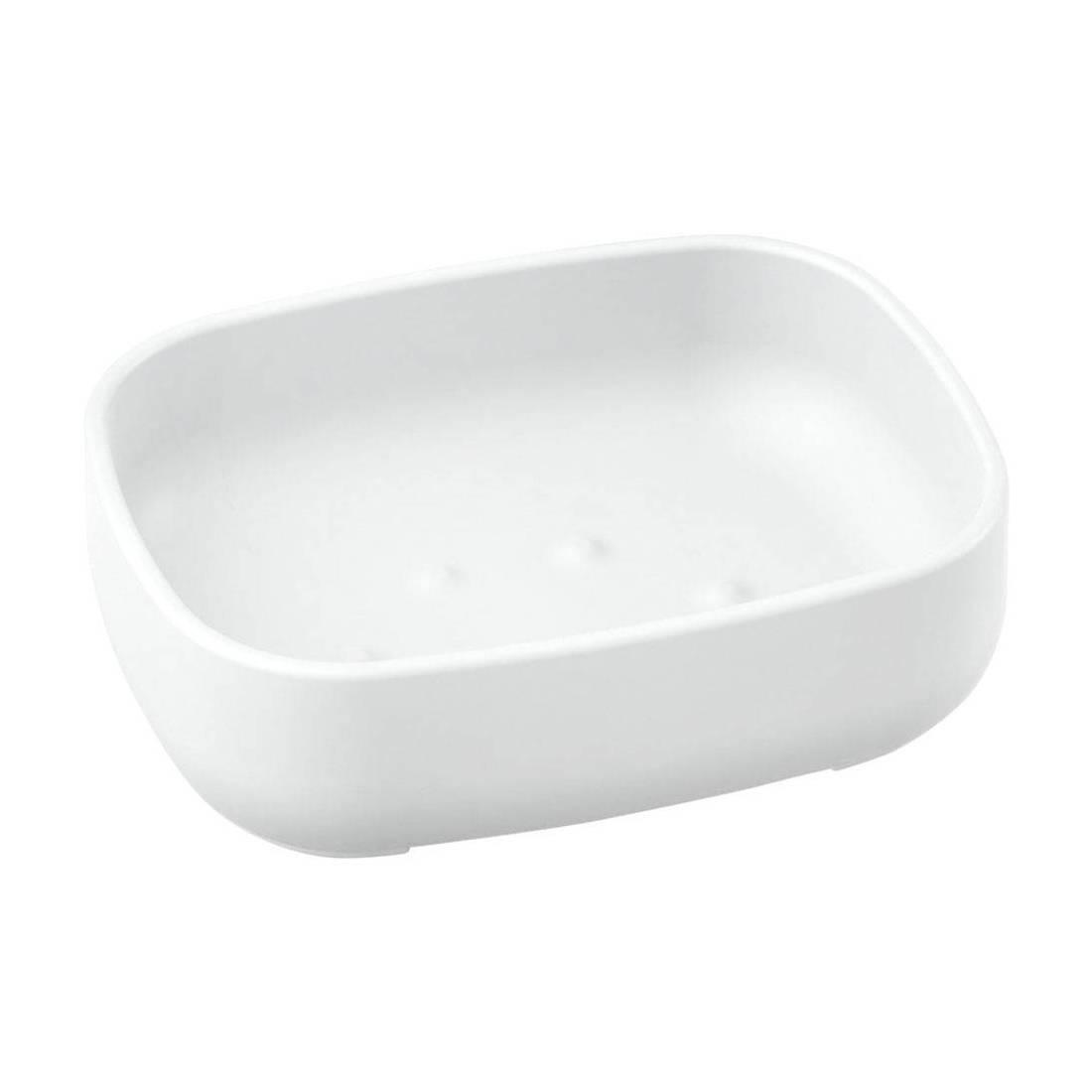 In resina termoplastica. Da appoggio, non fissabile a parete con viti o colla.