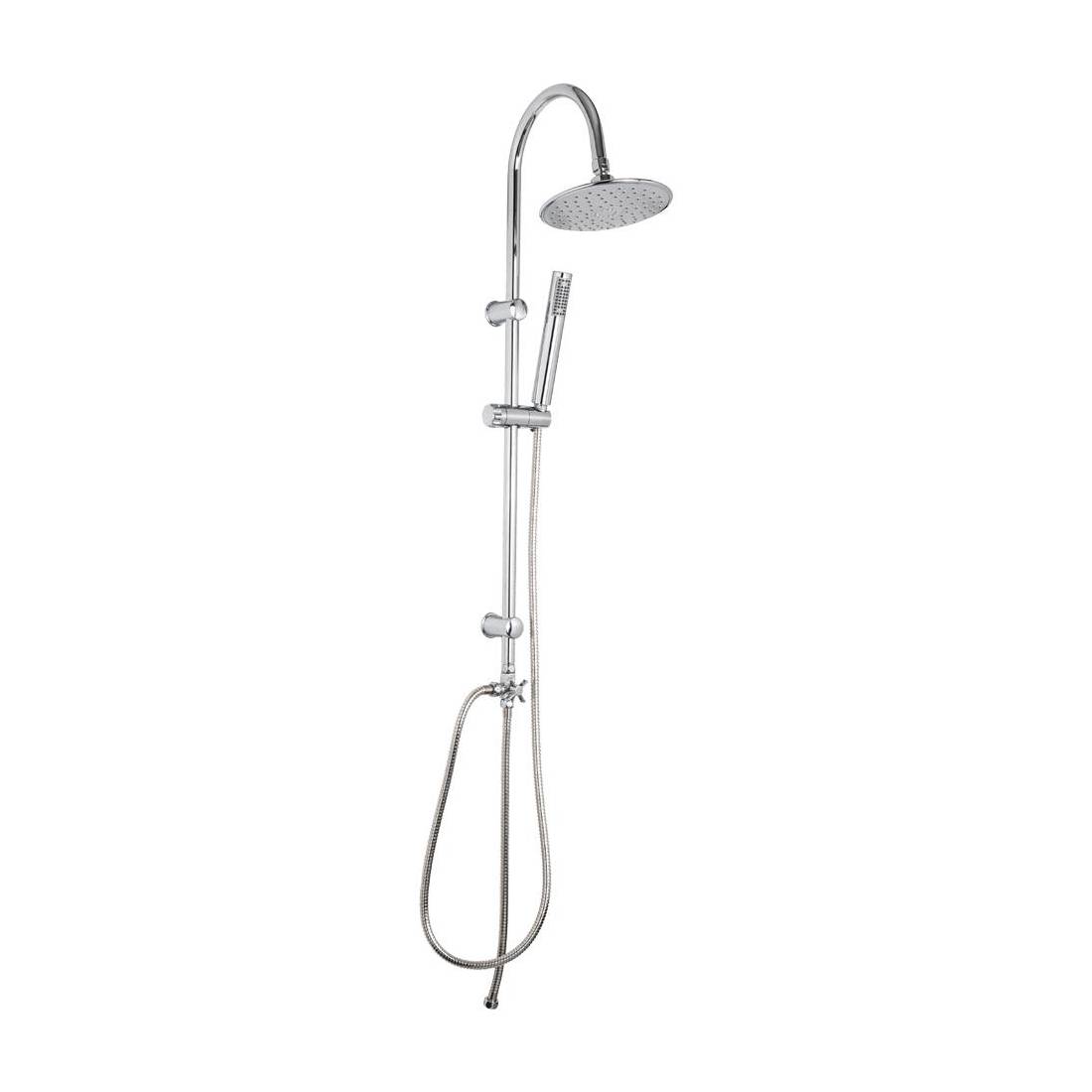 Interasse regolabile in acciaio inox cromato. Flessibile in acciaio inox con doppia aggraffatura da 150 cm e uno da 50 cm con raccordo da 1/2. Distanza tra gli attacchi a muro regolabile fino a 70 cm. Doccetta in abs ad un getto anticalcare Ø 3 cm e soffione da Ø 20 cm.