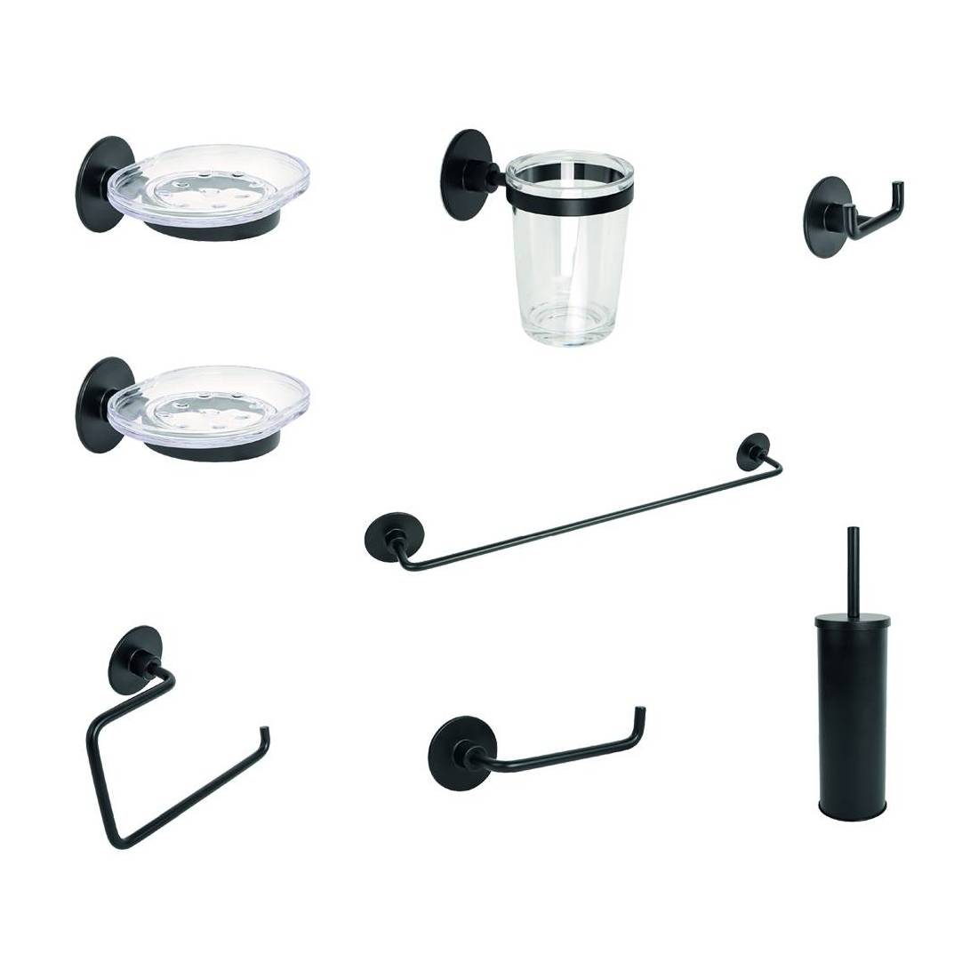 Realizzata in acciaio verniciato e leghe metalliche con contenitori in solido SAN trasparente. Finitura in nero opaco. Composizione: 2 porta sapone, 1 porta spazzolini, 1 appendiabito doppio, 1 porta asciugamani, 1 porta asciugamani ad anello, 1 porta rotolo aperto e 1 porta scopino da terra. Doppio sistema di fissaggio con viti e tasselli (già inclusi) oppure con biadesivo (non incluso). Garanzia 5 anni. In scatola.