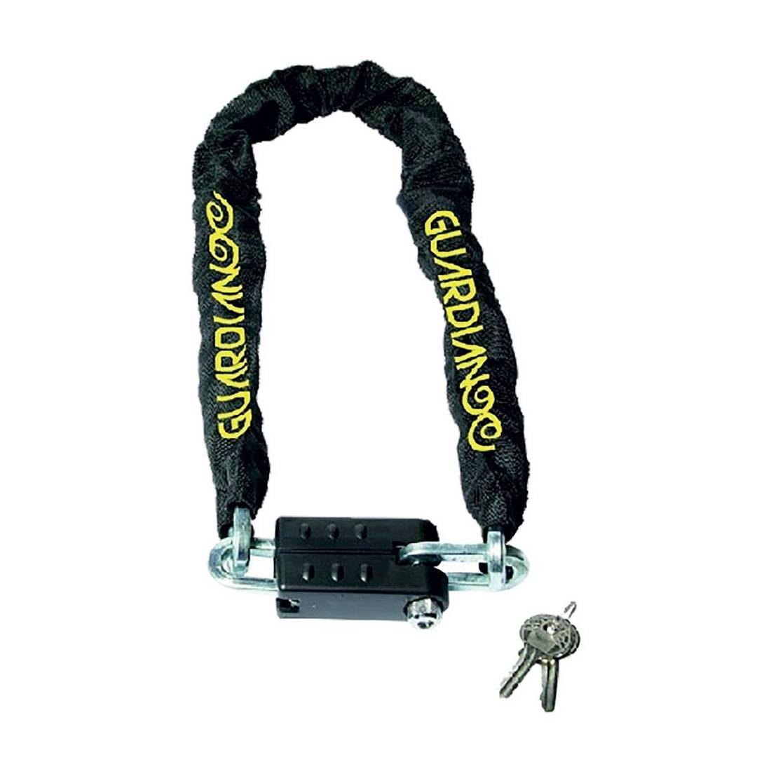 Con due chiavi. Catena cementata a sezione quadra ricoperta con guaina di tessuto. Corpo lucchetto rivestito in PVC antigraffio, sportello serratura antipolvere. Estrazione della chiave a lucchetto chiuso. Adatto anche per bici e scooter.