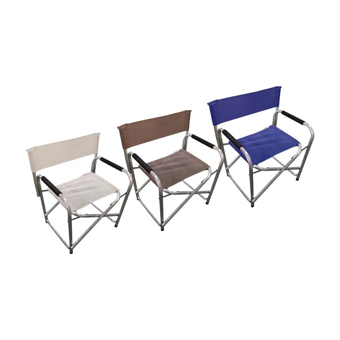 Struttura realizzata In alluminio, tubolari da Ø cm 2,5. Braccioli rivestiti in gomma morbida con schienale e seduta in tessuto textilene colorato. Dimensione: cm 47x57x80.