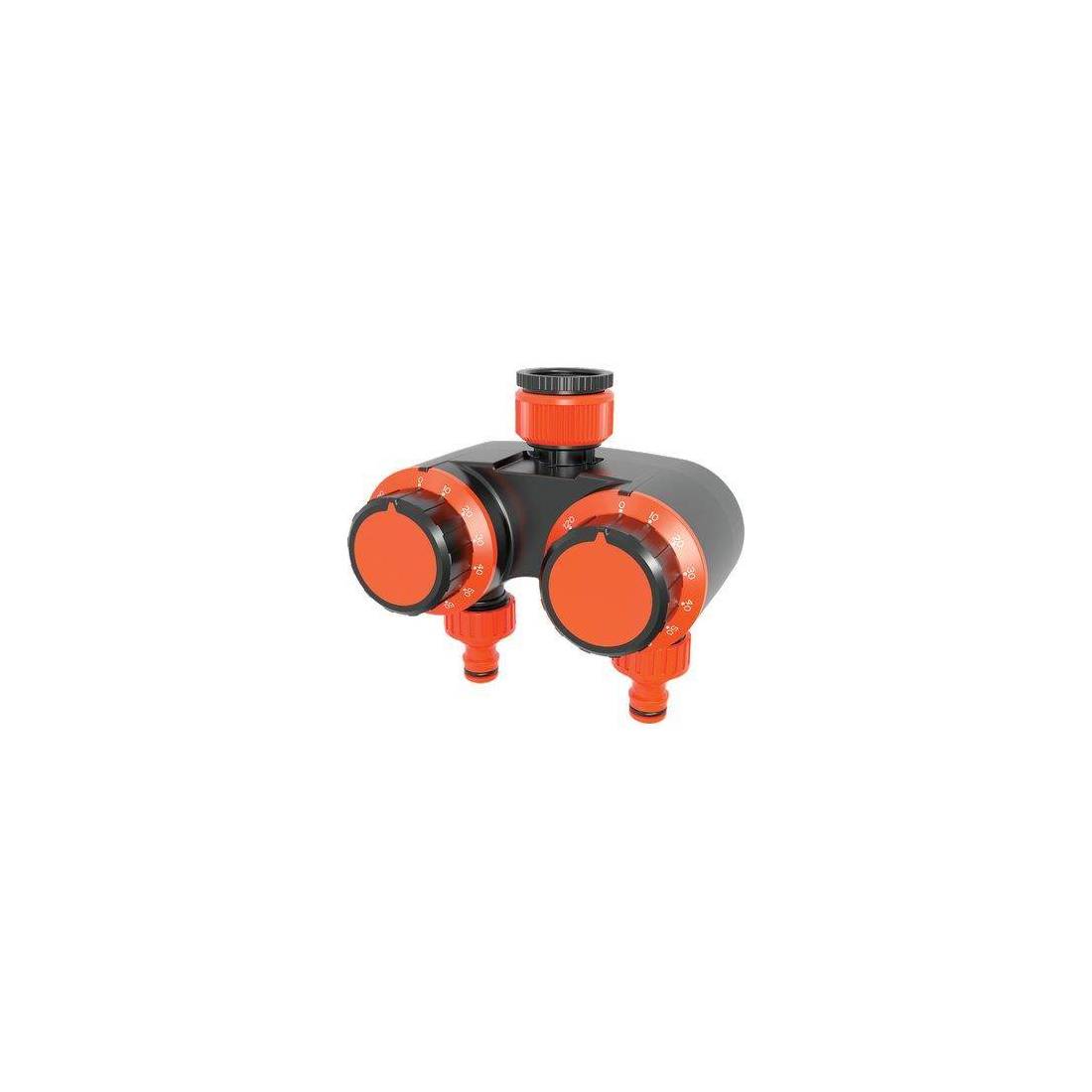 Programmatore manuale, facilissimo da usare. Il puntatore sulla corona può essere ruotato per un intervallo massimo da Min. 1 a 120. Fornita con presa rubinetto filettata 1" e riduzione 3/4. Per 2 settori di irrigazione.